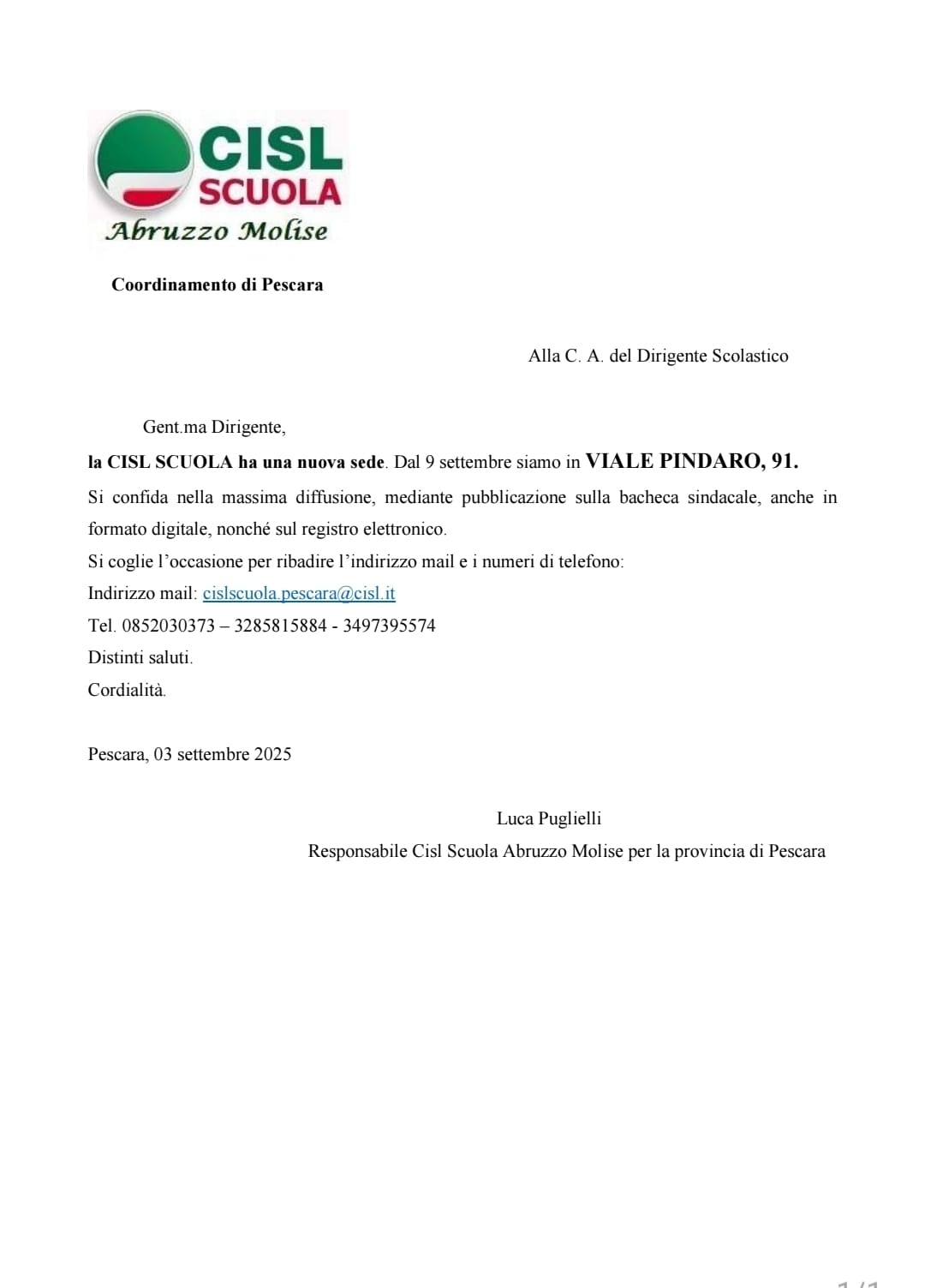 - 📢 CISL SCUOLA: CAMBIO SEDE dal 9 settembre —> comunicazione