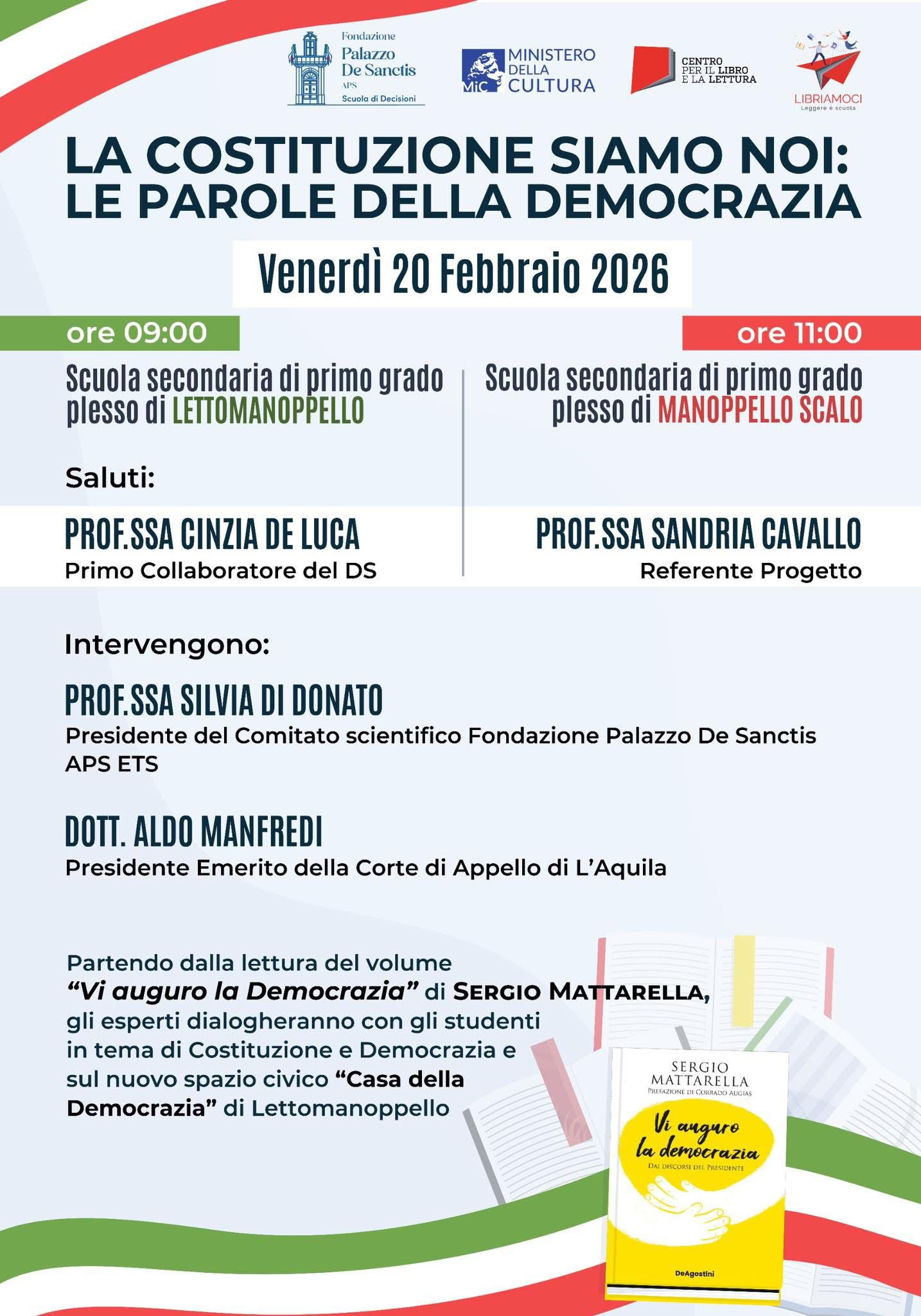 Il percorso didattico è stato progettato in collaborazione con la Fondazione Palazzo De Sanctis APS ETS, partner culturale del progetto e promotrice della Casa della Democrazia di Lettomanoppello. Le attività ruoteranno attorno al volume “Vi auguro la democrazia. Dai discorsi del Presidente” di Sergio Mattarella, una raccolta di interventi che invita a coltivare la democrazia come un bene prezioso, fondato su rispetto, pace, tutela dell’ambiente e partecipazione civica e prevedono: